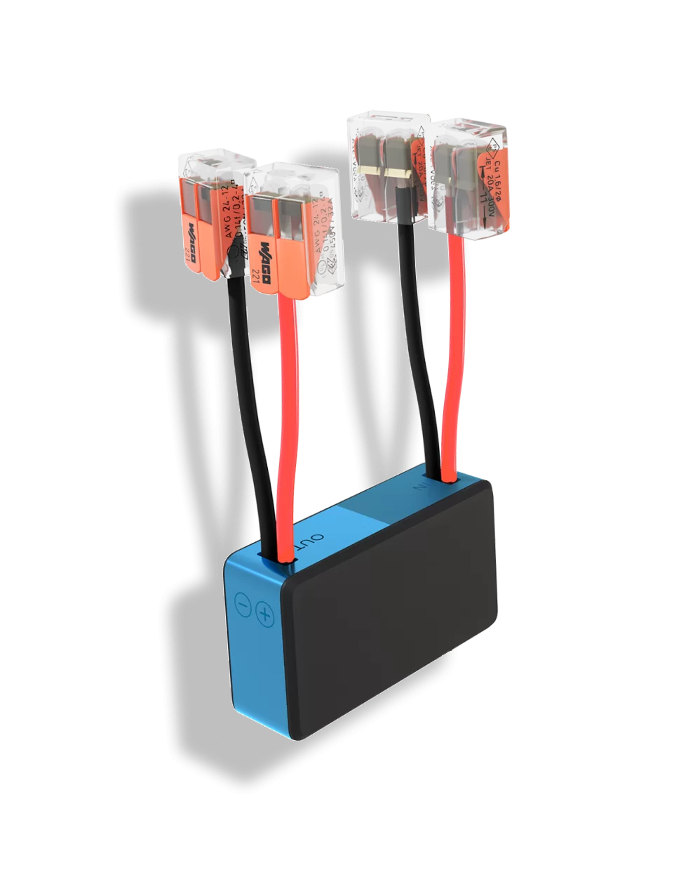 На вход к устройству с помощью самозажимных клемм подключается блок питания 12В или 24В, а на выход диммируемая лампа, светодиодная лента или электрозамок.